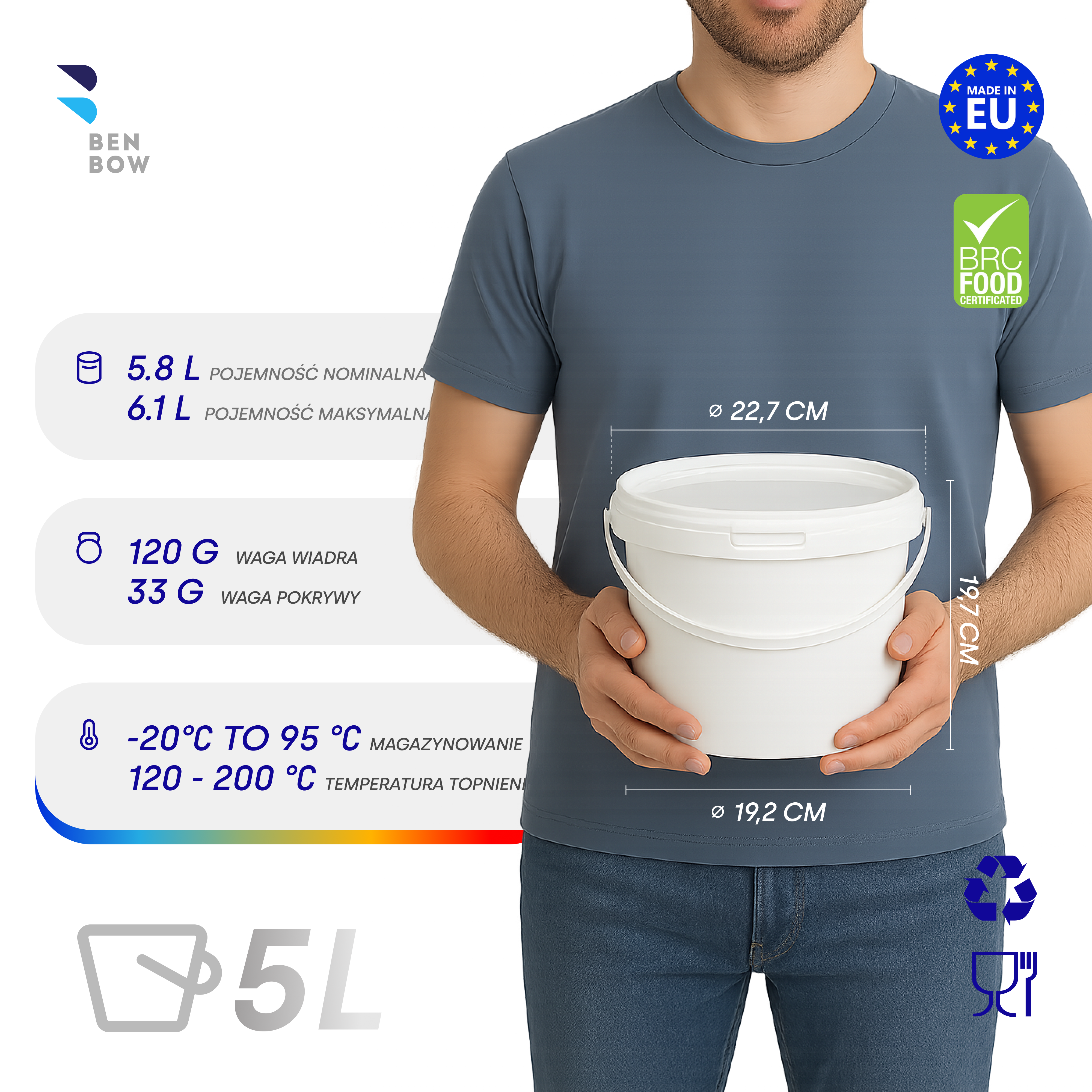 | Zastosowanie | POJEMNIK SPOŻYWCZY: kapusta, ogórki i inne kiszonki, smalec, masło, tłuszcze, mąka, cukier, przyprawy, sosy, twaróg, bryndza, nabiały, miód, marmolada, dżem, słodkości CHEMIA: proszek do prania, płyny do czyszczenia, chemia gospodarcza |