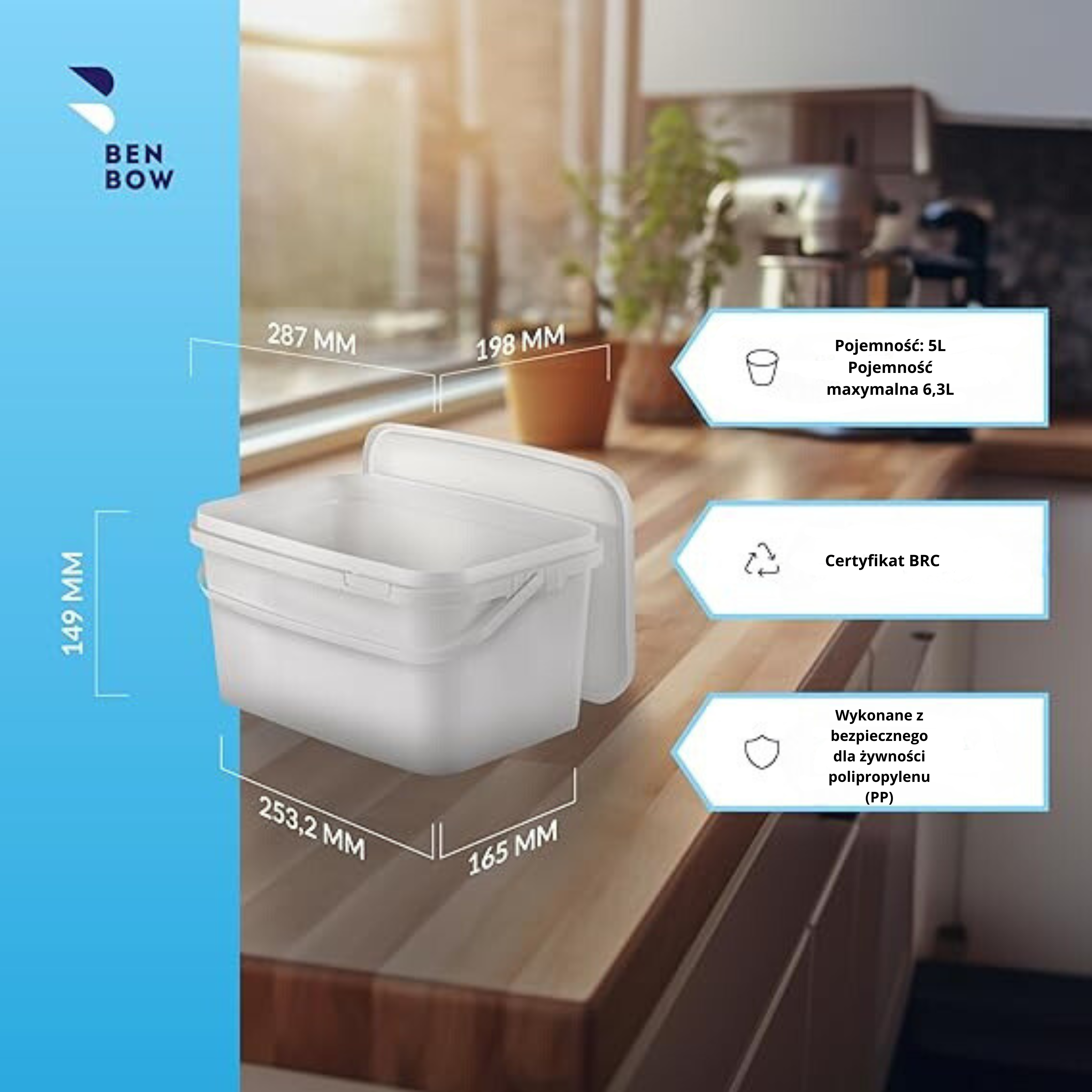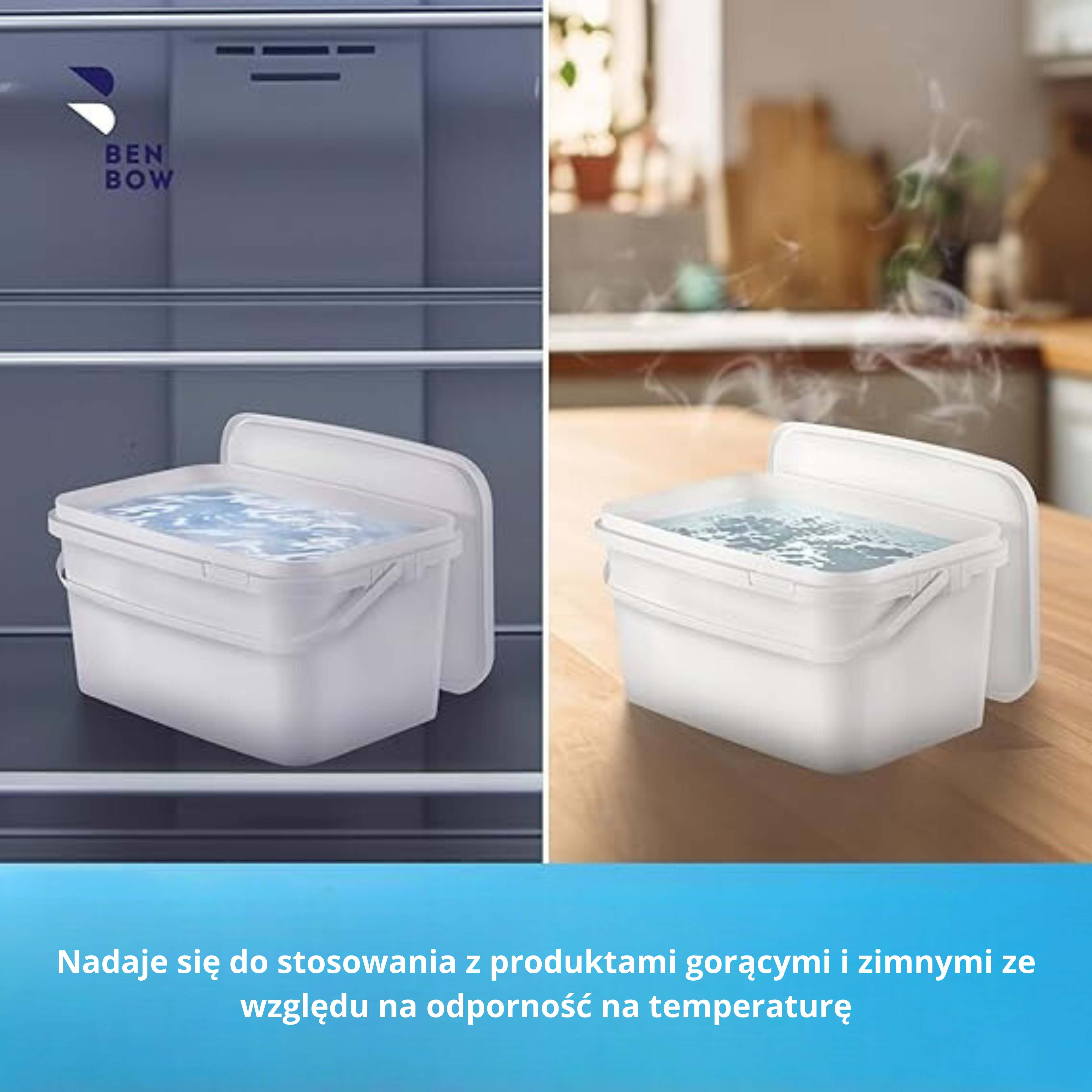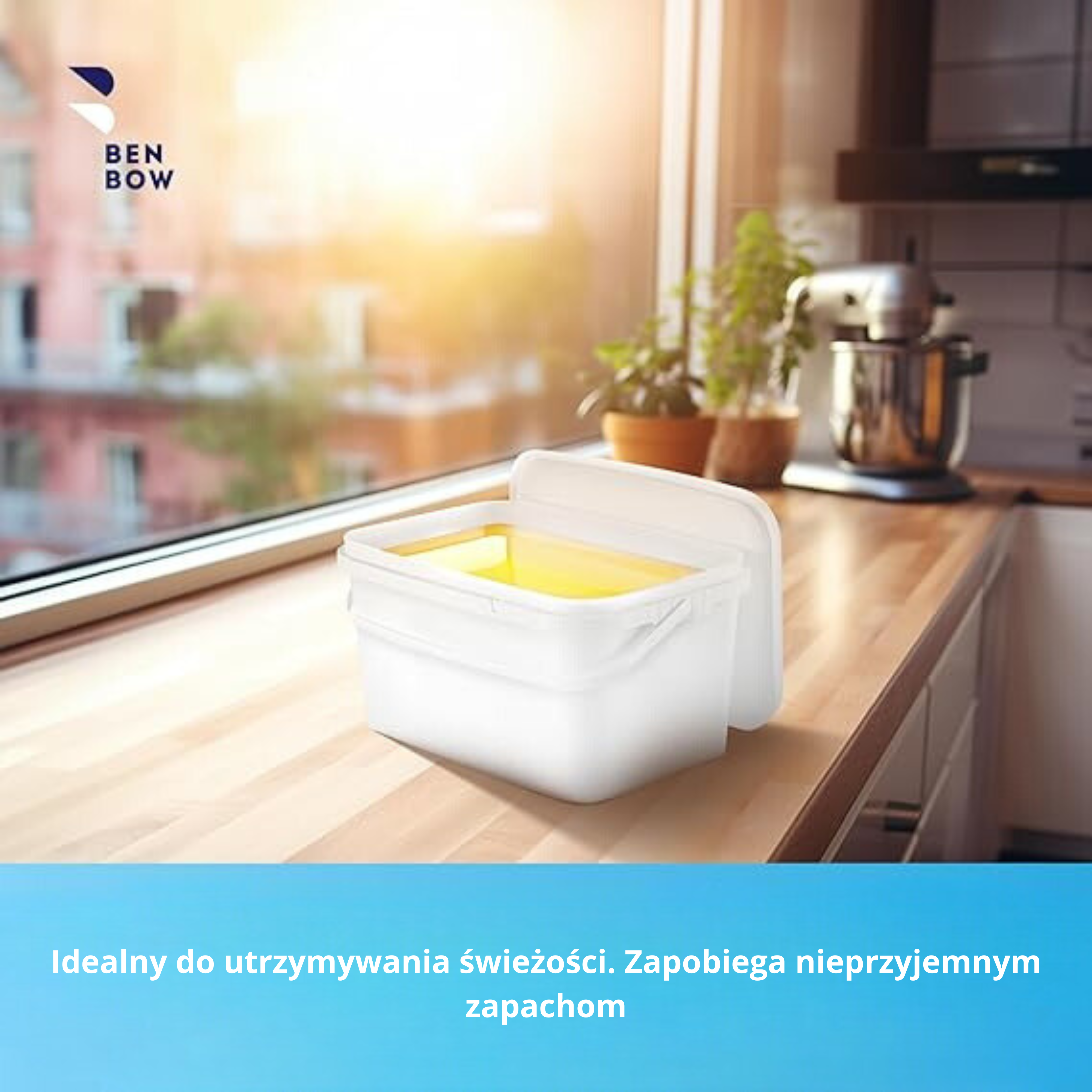 Bezpieczne przechowywanie żywności - prostokątne i bezzapachowe wiadro BenBow o pojemności 5 litrów z praktycznym uchwytem jest niezbędnym narzędziem do higienicznego i hermetycznego przechowywania żywności w gospodarstwach domowych, restauracjach i przemyśle spożywczym. Idealnie nadaje się do produktów, które nie mogą wysychać, wchłaniać wilgoci ani uwalniać nieprzyjemnych zapachów do otoczenia. Idealnie nadaje się również do marynowania.