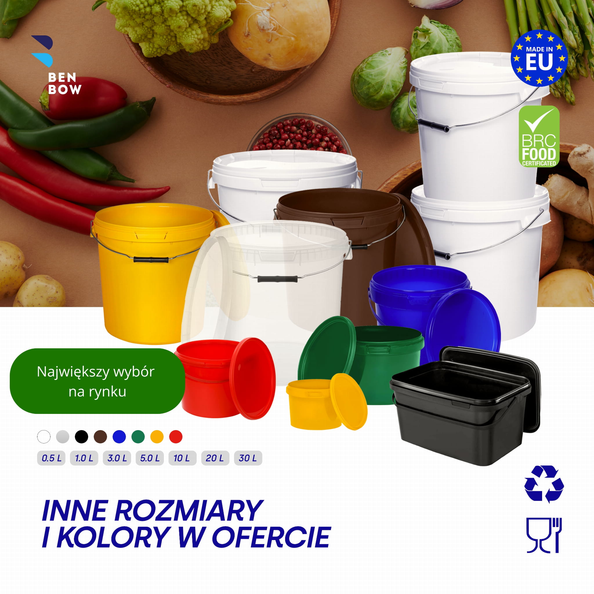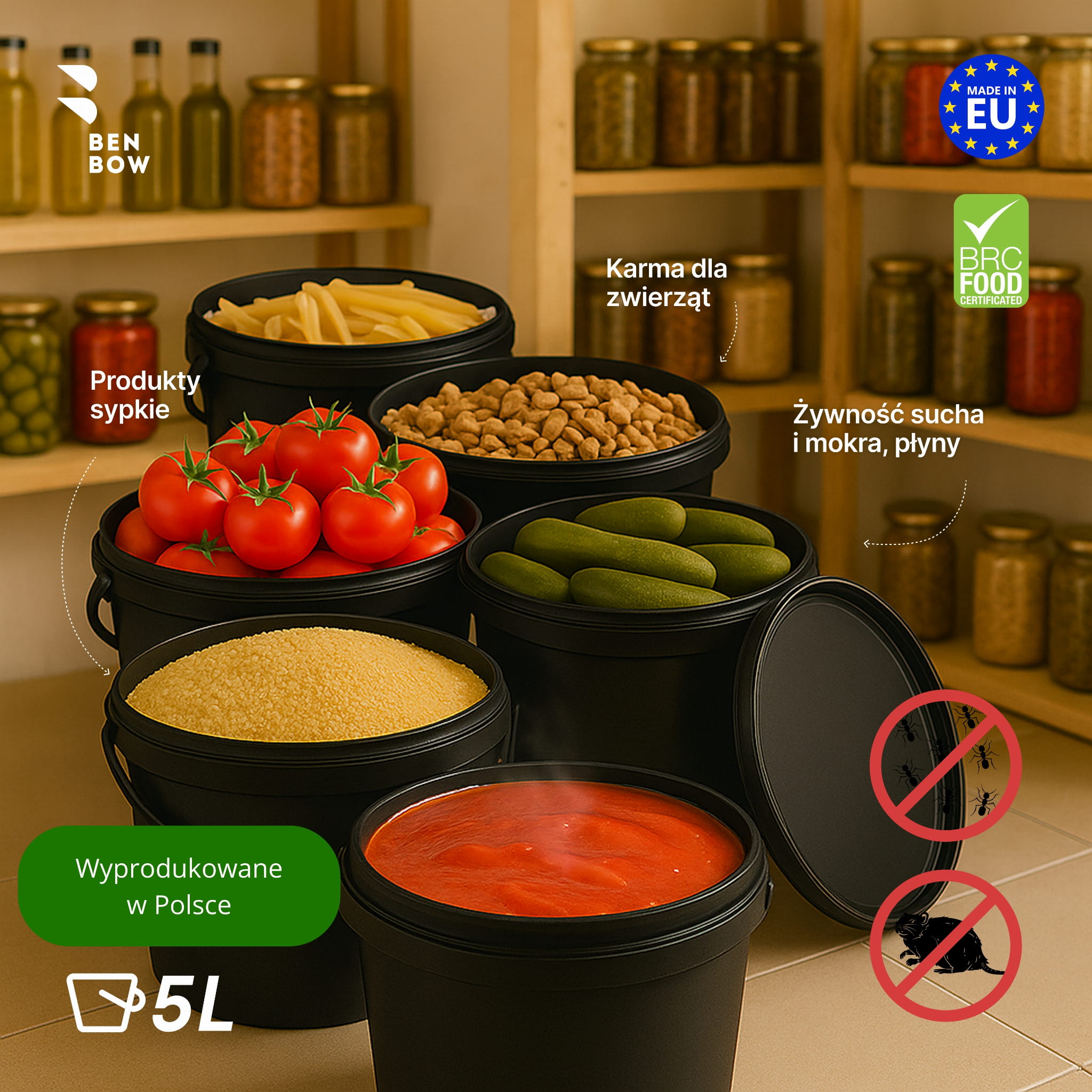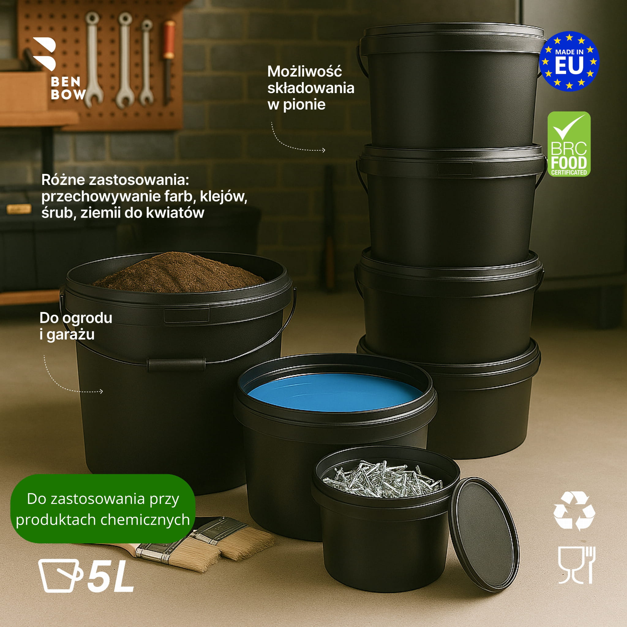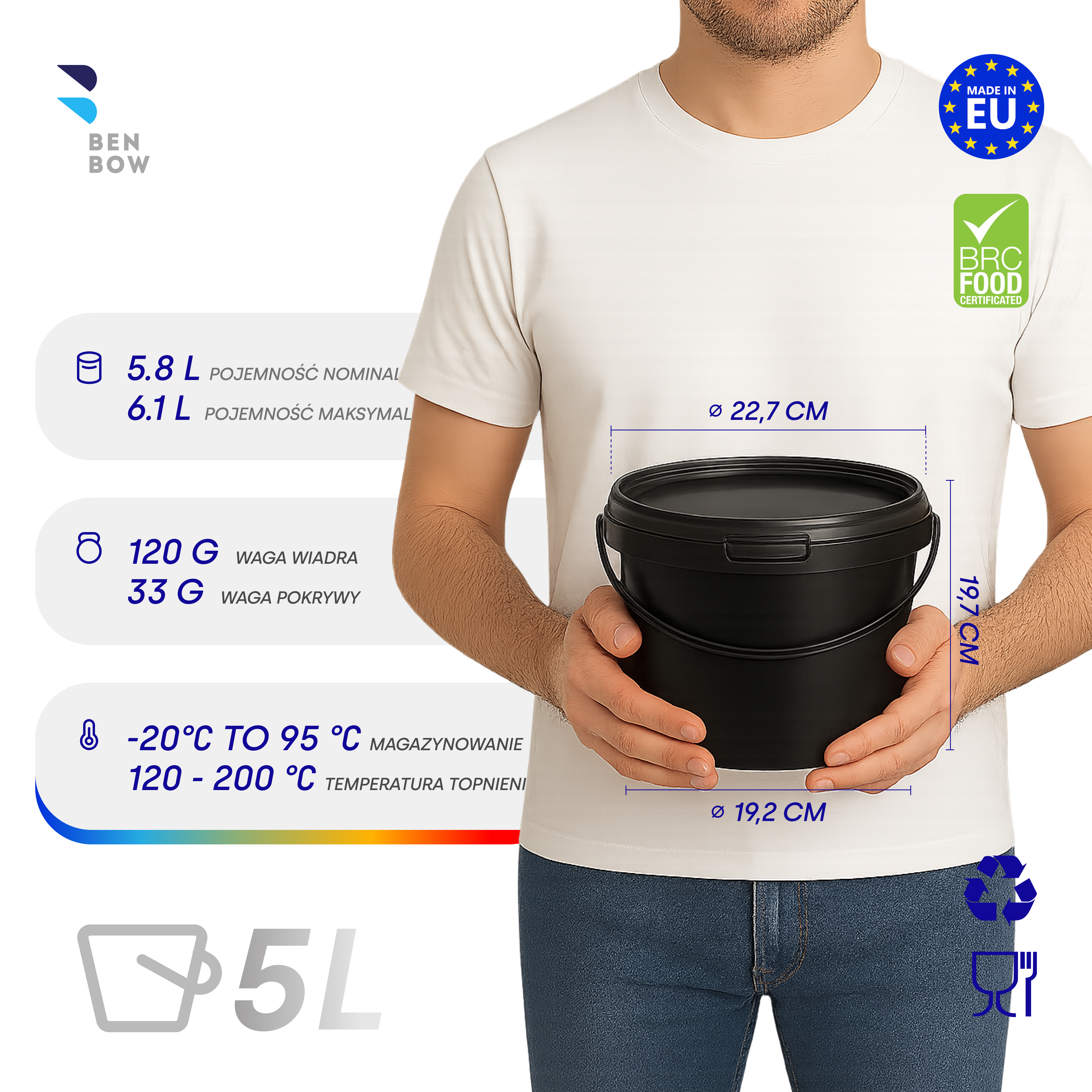 Przeznaczone do branży spożywczej i chemicznej – wysokiej jakości pojemnik bez szkodliwych dla zdrowia i środowiska składników. Bezpieczne przechowywanie żywności – dzięki hermetycznemu zamknięciu, jedzenie zachowuje świeżość i w żaden sposób nie zmienia smaku. Idealne do konserw, lodów, sosów, marynat, syropów itp. Bezpieczne artykuły chemiczne – pojemniki przystosowane są także do przechowywania artykułów z branży chemicznej, takich jak: farby, kleje, proszki do prania czy też nawozy. Są lekkie i wystarczająco mocne, by wytrzymać transport i zapewnić odpowiednią ochronę substancji. Wysokiej jakości polipropylen (PP) – wytrzymały w użytkowaniu i przechowywaniu, nadający się do recyklingu i przyjazny dla środowiska. Posiada międzynarodowy certyfikat bezpieczeństwa BRC. Pojemnik może być podgrzewany w mikrofalówce. Produkt jest odporny na wysokie temperatury (temperatura zmiękczania 120 – 200 OC). Wiadro 5L