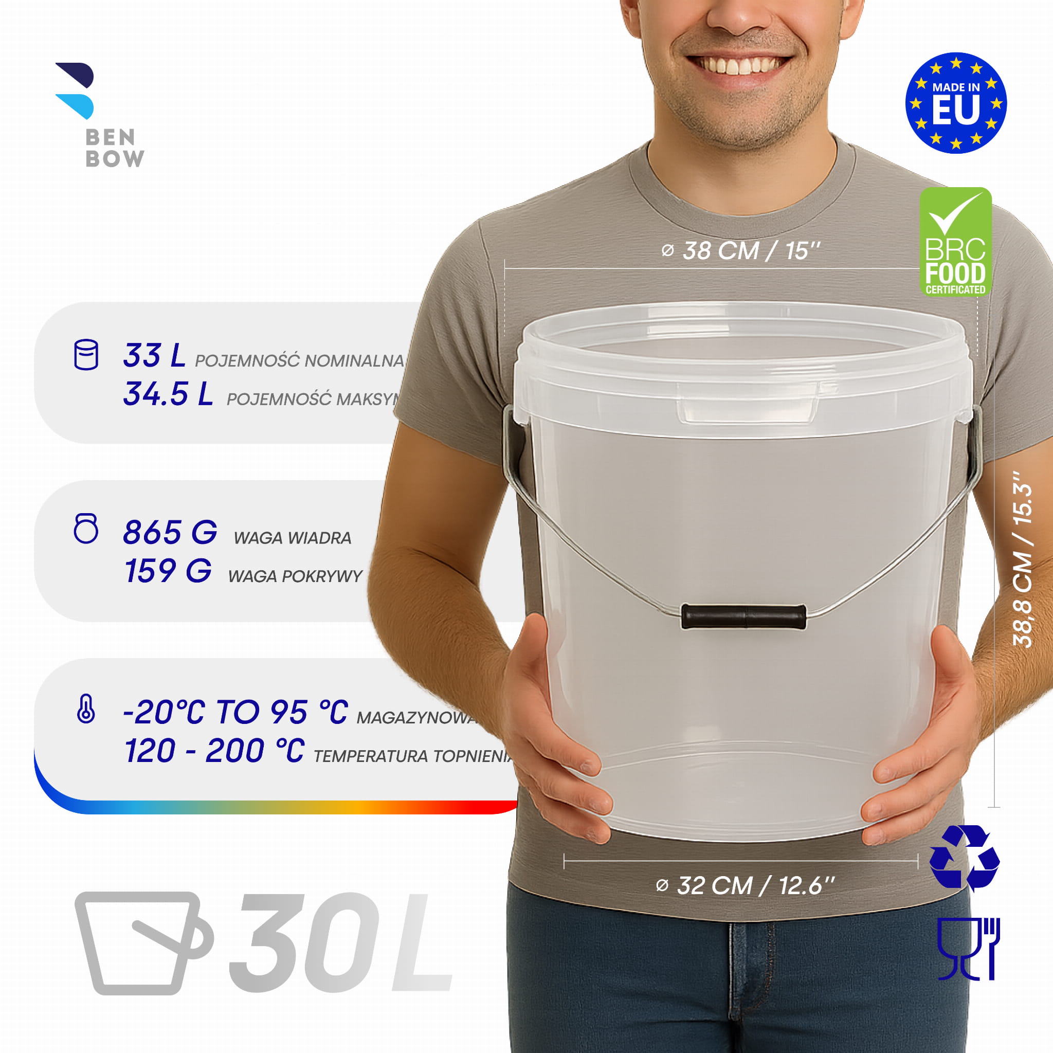 | Zastosowanie | POJEMNIK SPOŻYWCZY: kapusta, ogórki i inne kiszonki, smalec, masło, tłuszcze, mąka, cukier, przyprawy, sosy, twaróg, bryndza, nabiały, miód, marmolada, dżem, słodkości CHEMIA: proszek do prania, płyny do czyszczenia, chemia gospodarcza |