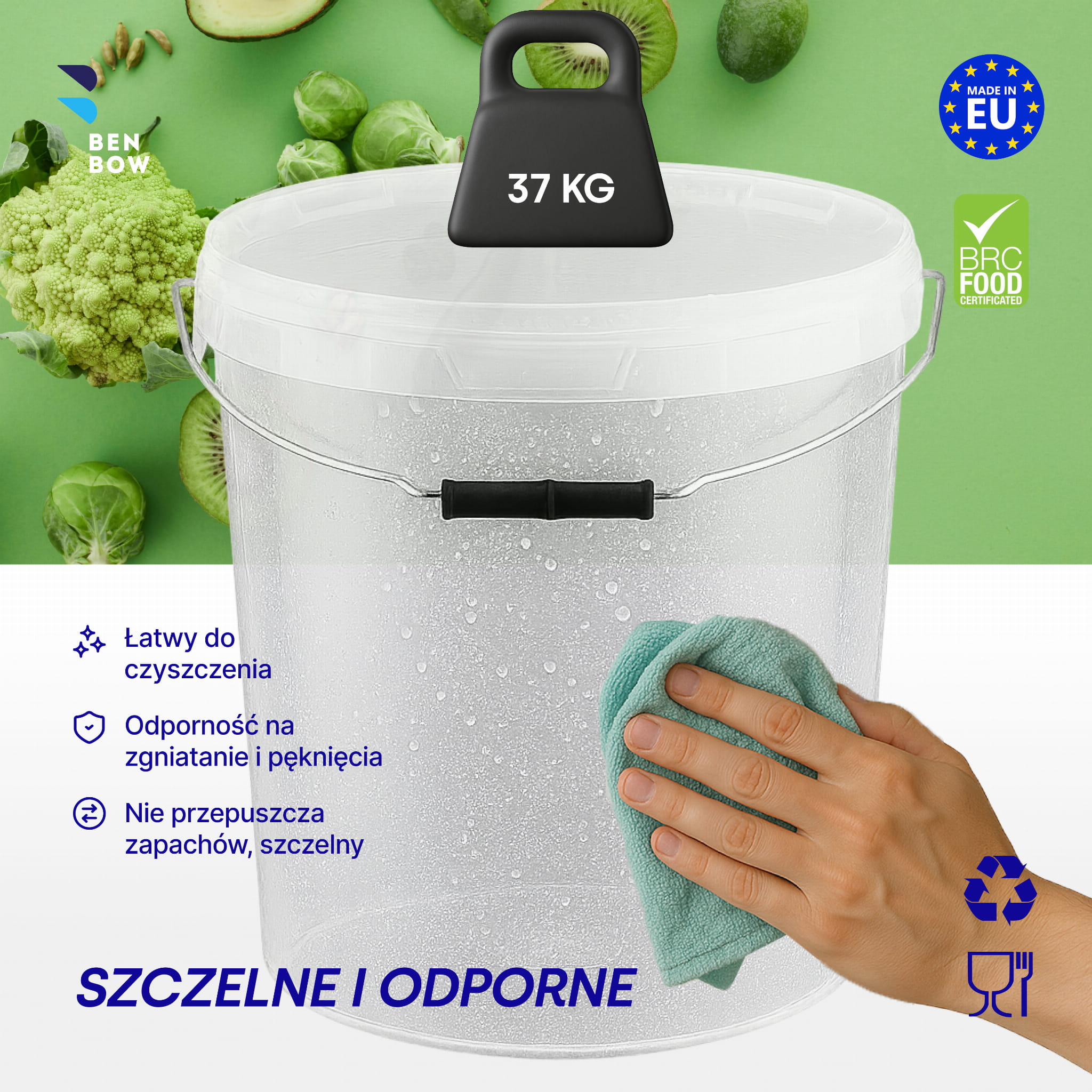 Zastosowanie POJEMNIK SPOŻYWCZY: kapusta, ogórki i inne kiszonki, smalec, masło, tłuszcze, mąka, cukier, przyprawy, sosy, twaróg, bryndza, nabiały, miód, marmolada, dżem, słodkości CHEMIA: proszek do prania, płyny do czyszczenia, chemia gospodarcza