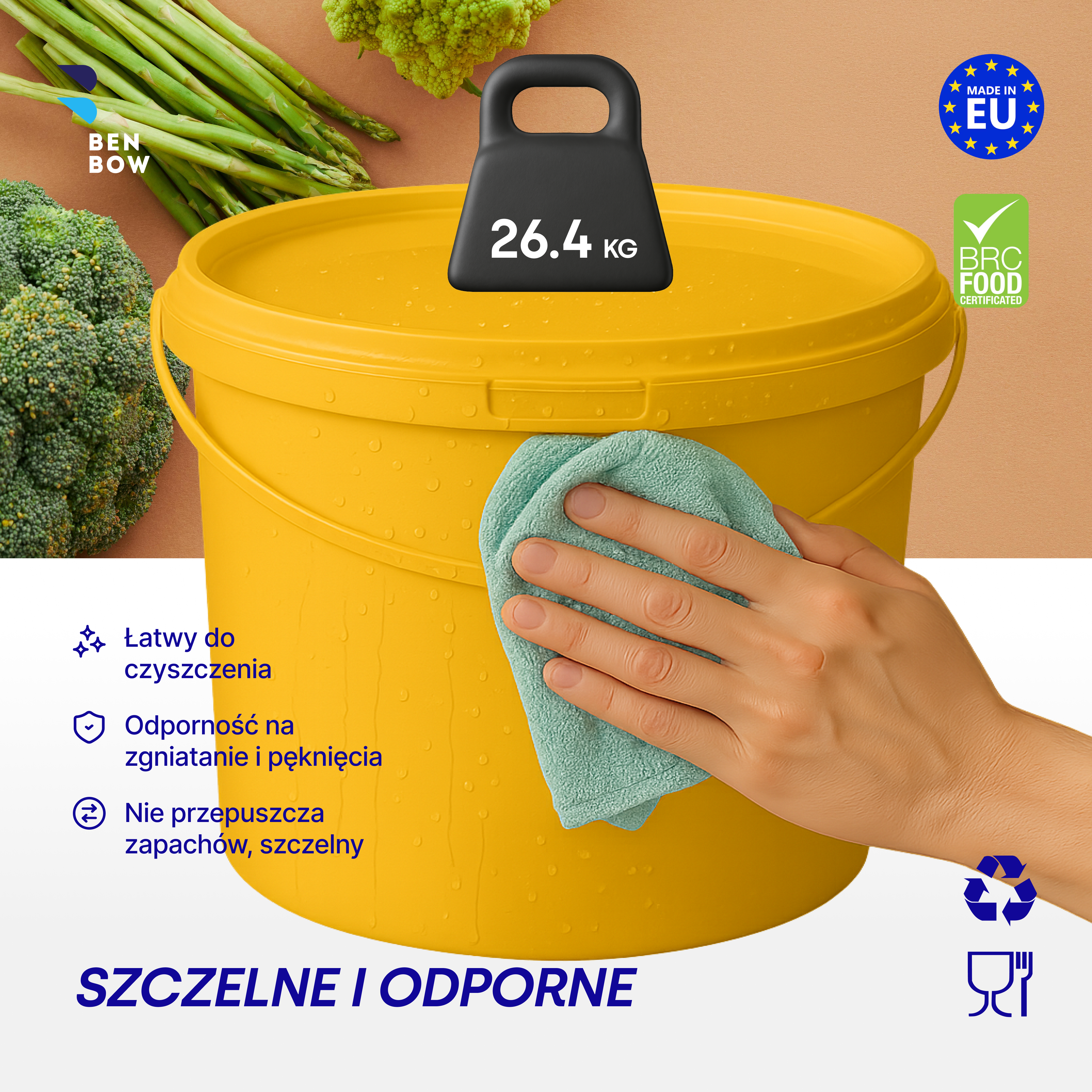 Przeznaczone do branży spożywczej i chemicznej – wysokiej jakości pojemnik bez szkodliwych dla zdrowia i środowiska składników. Bezpieczne przechowywanie żywności – dzięki hermetycznemu zamknięciu, jedzenie zachowuje świeżość i w żaden sposób nie zmienia smaku. Idealne do konserw, lodów, sosów, marynat, syropów itp. Bezpieczne artykuły chemiczne – pojemniki przystosowane są także do przechowywania artykułów z branży chemicznej, takich jak: farby, kleje, proszki do prania czy też nawozy. Są lekkie i wystarczająco mocne, by wytrzymać transport i zapewnić odpowiednią ochronę substancji. Wysokiej jakości polipropylen (PP) – wytrzymały w użytkowaniu i przechowywaniu, nadający się do recyklingu i przyjazny dla środowiska. Posiada międzynarodowy certyfikat bezpieczeństwa BRC. Pojemnik może być podgrzewany w mikrofalówce. Produkt jest odporny na wysokie temperatury (temperatura zmiękczania 120 – 200 OC).